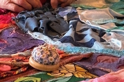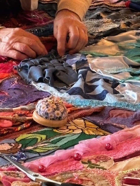 Voor de zaterdag groep was het bijzonder om door te gaan op het werk van anderen. Op één onderdeel werden de applicaties nog wat herschikt, om de ´beweging’ die in het ontwerp zat beter te benaderen. Dat is iets wat je in je eigen werk niet leuk zou vinden. Maar met respect voor het werk van de voorganger, voegden de zaterdagse deelnemers hun details toe aan de basisstukken van dinsdag. En zo ontstond een gemeenschappelijk werk. Op zaterdag werden er vooral banen van kant en linten vastgezet en versieringen toegevoegd aan de basislappen; kralen, borduurwerk, zelfgetekende applicaties.