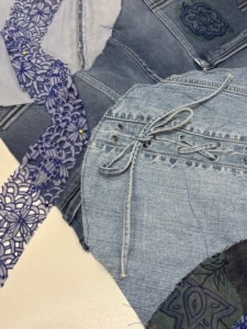 Wij ontmoetten elkaar op zaterdag 29 november in Nijmegen. Daar maakten we het jeans paneel mee af, waarvoor op de 25e door de eerste groepen een basis was gemaakt. We konden daarbij putten uit de vijf schatkisten met textiel materiaal die met het project mee rondreizen. Gedoneerde lappen en jeans, maar ook handwerkjes, kant, garens, kralen lint en andere versieringen.