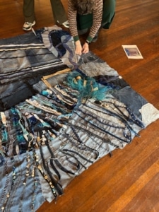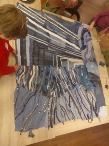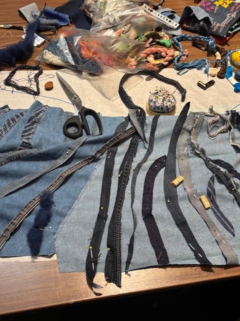 Ons ontwerpdeel bevatte strand, wad en golvend water. Voor het jeansdeel konden we ons niet uitleven in kleuren, en moesten we vooral letten op voldoende contrast en/of structuur in de lappen die we verwerkten. En aan het eind van die eerste dag waren er vier deelstukken gereed, waarop de groep van zaterdag (letterlijk) kon doorborduren.