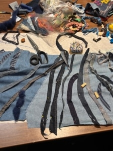 Vooral op zaterdagmiddag bewees de meereizende naaimachine goede diensten en ploegde zich door X lagen jeans heen, om de verschillende patroondelen ook weer aan elkaar te zetten. Wel aangestuurd door 3 personen om alles goed langs die naald te geleiden en alles wat op de onderdelen was aangebracht te ontzien. Pff, peentjes zweten, maar het lukte! Eind van die zaterdag zaten alle losse onderdelen van de Nijmeegse bijeenkomsten aan elkaar.