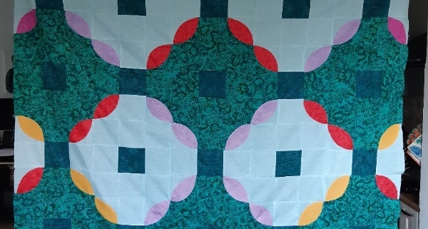 Dat had ik wel gehoopt, maar niet echt verwacht, nog voor de zomervakantie. Ik moet bekennen dat ik de vorige keer een beetje gesjoemeld heb met de volgorde van de handelingen. Volgens het schema moest je eerst alles snijden, daarna alle ovalen met kleur 1 en dan met kleur 2 maken. Ik had al niet alles gesneden. Wel alle ovalen en bijbehorende holle driehoeken, maar nog niet alle vierkanten. Alleen maar net genoeg vierkanten om 1 blok te kunnen maken, voor mijn blogbericht. En voor dat ene blok had ik ook precies genoeg ovalen units gemaakt. Dat betekende natuurlijk wel dat ik voor dit blogbericht dus keihard aan de gang moest om de top toch nog af te krijgen. En dat heb ik gedaan. Poepoe, ik ben er nog moe van.