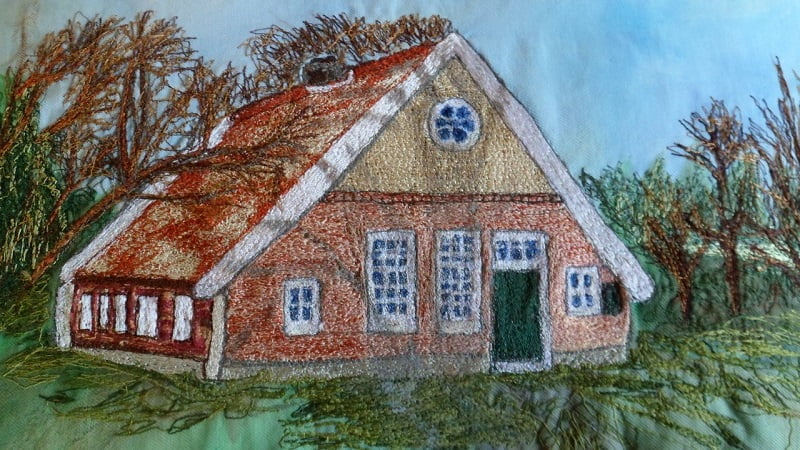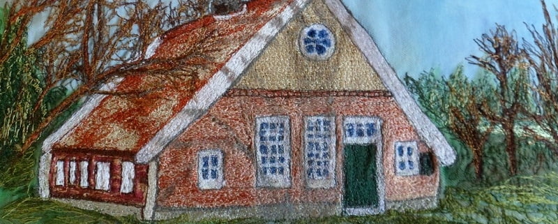 Mijn eerste probeersel was De Knoef. De printer vergrootte de foto tot het formaat dat ik wilde. Met behulp van een lichtbak trok ik de print over op katoen. Dit kreeg versteviging en ging in een borduurraam. Alles ingeschilderd met stofverf. De contouren, daklijsten, ramen, etc. van het huis zijn in Free Motion Quilting genaaid. De bomen en de schaduwen zijn ook met FMQ vormgegeven. Ik gebruikte gewoon naaigaren, waardoor de achterkant wat dik en stug werd.