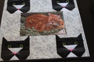 De foto van de poes is met de computer geprint op fotofabric. Hier heb ik niet alles met garen bedekt, maar bleef de ondergrond en de schaduwwerking zichtbaar. Contouren, ogen, oren en details werden nauwkeurig gevolgd. De lichtste plekken zijn onbewerkt, de donkere delen juist veel. Daardoor komen delen naar voren en lijkt de poes wolliger. De achtergrond van bladeren is zo gequilt dat het kussen net te zien is. Ook hier heb ik borduurgaren gebruikt met borduurondergaren. De fotofabric verbleekt na verloop van tijd in de zon. Tegenwoordig is er een spray om de print te beschermen. Niet in de zon leggen, helpt ook.