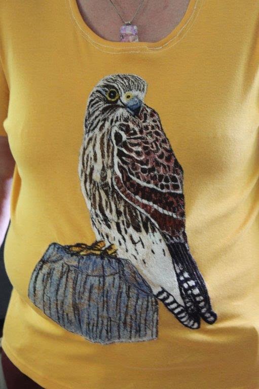 Het werk uitknippen met een randje voor de zigzag. In twee ronden zigzaggend op een shirt genaaid. Ik gebruikte borduurgaren in de kleuren van de verschillende vogelonderdelen.