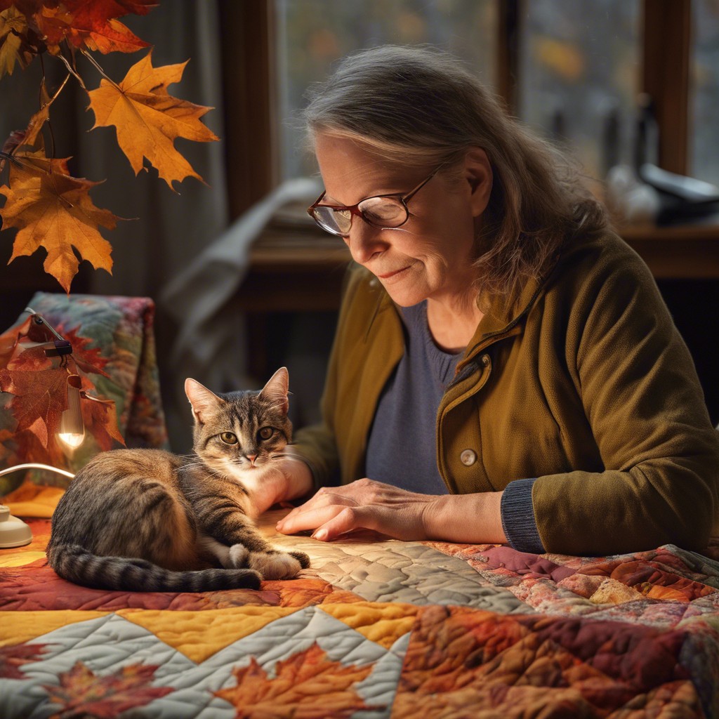 Nee, ik zie er niet ineens heel anders uit en mijn kat is niet ineens 15 jaar jonger. Ik heb weinig foto’s gemaakt de afgelopen periode. En om toch een gezellig herfstsfeertje te creëren heb ik AI gevraagd ons te voorzien van een foto van een quilter die aan tafel bezig is aan een quilt in herfstkleuren, met een goed werklicht, bij een herfstregenbui. En ook een comfortabele kat bij de afbeelding. En dat leverde bovenstaande afbeelding op. Niks meer aan doen. Ziet er ook uit als een leuk patroon.