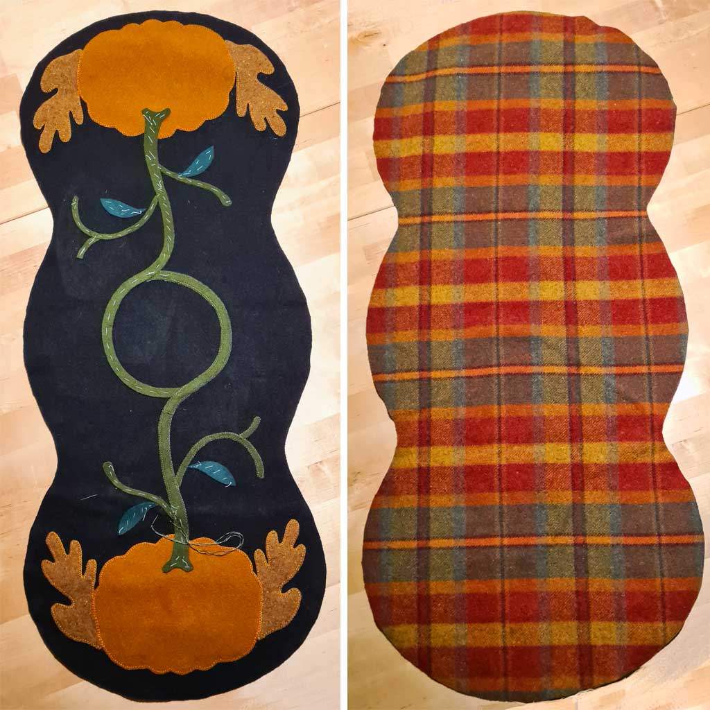 Ik begin wel te merken dat mijn aandacht wat aan het verschuiven is. Terwijl ik nog heerlijk bezig ben met de pompoenbladeren en de herfstkleuren bij het appliqueren hoor ik ook al kerstliedjes op de achtergrond. Ik doe dit jaar mee in een kerstkoor en sinds eind september heb ik al de hele tijd kerstmuziek om mij heen. Het herfstweer met stormen en af en toe zo’n mooie gouden zon en strakblauwe lucht helpt wel om de sfeer van dit seizoen erin te houden, maar ik kan toch niet voorkomen dat mijn ogen af en toe afdwalen naar het mandje met de kerstprojecten.
