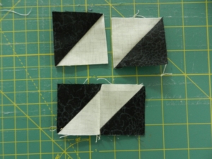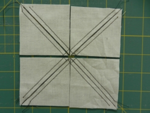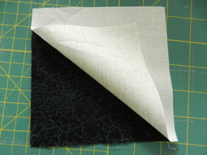 Strijk vierkantjes open, naadtoeslag aan donkere zijde. Snijd of knip op maat. 5,5×5,5 cm. (4×4 cm + 2x 0,75 cm naadtoeslag).