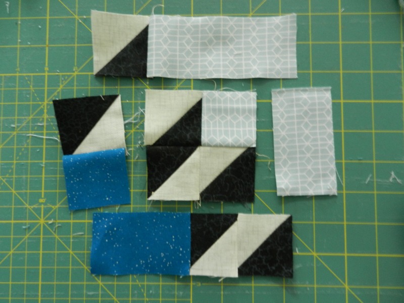 Naai een zwartwit vierkantje boven A-donker. Naai dit links aan blok.