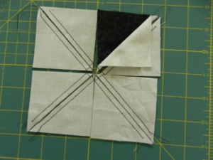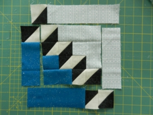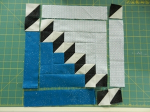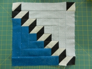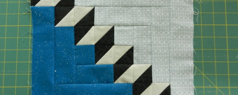 Hoi daar ben ik weer, Gerie. Ja, ik zie je al denken, Staircase Block? We zouden nu toch deel 2 van het snijden van de driehoeken krijgen, met de formules voor Half Square Triangles? Ja, dat klopt, maar die beschrijving heb ik nog niet helemaal af en deze wel. Ik heb nu geen energie om de Half Square Triangle beschrijving te maken, maar daar ga ik zo spoedig mogelijk mee aan de slag. Ondertussen kun je bij dit blok ook al 8 Half Square Triangles in 1 keer maken. Ook leuk. Dat gedeelte van de foto’s komt ook dubbel, dat is toch gemakkelijker dan steeds switchen.