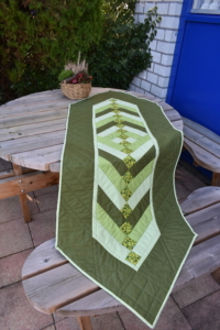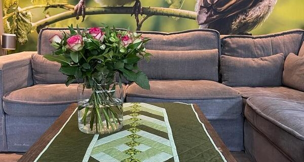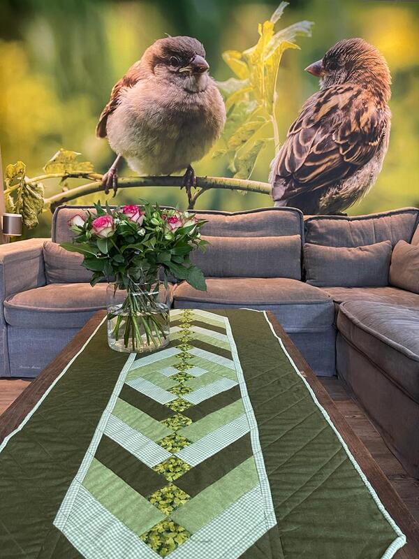 Begin oktober werd ik door een vroegere collega gevraagd om een tafelloper te maken. Ik vind het altijd leuk en uitdagend om iets moois voor een ander te maken. De wens was een tafelloper in groene kleuren in de maten 135 x 60 cm. De gewenste lengte was zonder de punten die eraan gemaakt moesten worden.