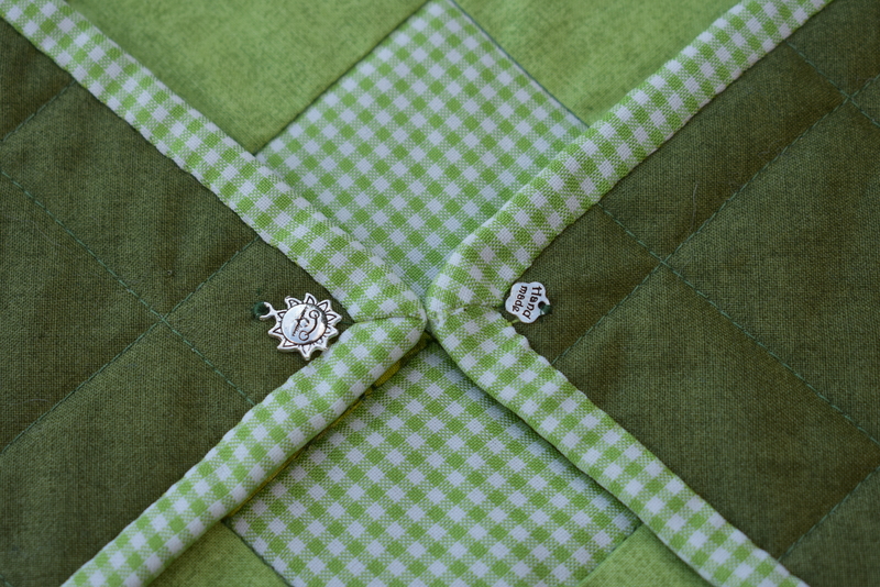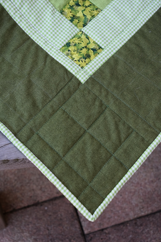 Nadat de top klaar was, heb ik hem gesandwiched met een dunne vliesvulling geschikt voor tafellopers. Dit voorkomt dat voorwerpen op de tafelloper omvallen. Voor de achterkant werd dezelfde groene stof gebruikt als voor de stroken en randen van de top. Ik heb de 3 lagen in de naad gequilt en door laten lopen in de rand. De punten van de loper kregen een grof raster. Het geheel werd afgebiesd met de polyester blokjesstof. Om te voorkomen dat de bies vroegtijdig loslaat vanwege het rafelen, heb ik de bies na het aanzetten met een zigzagsteek extra verstevigd. Dat is geen gangbare werkwijze maar in dit geval vond ik het gerechtvaardigd.