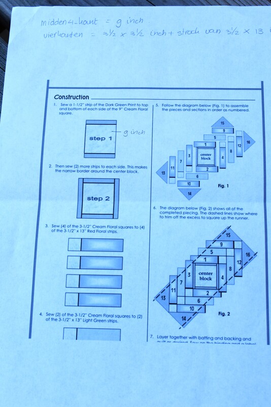 Gelukkig vond ik een goede schematekening (zie afbeelding hieronder) en was ik erg blij met mijn inch-lineaal die ik op de voorlaatste quiltbeurs had aangeschaft. Zoiets komt altijd wel een keer van pas :-)