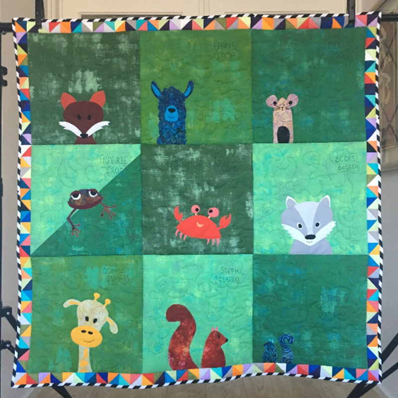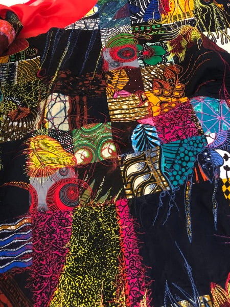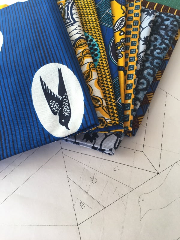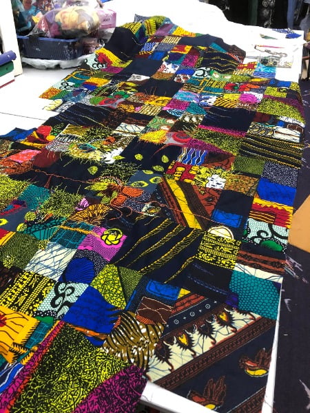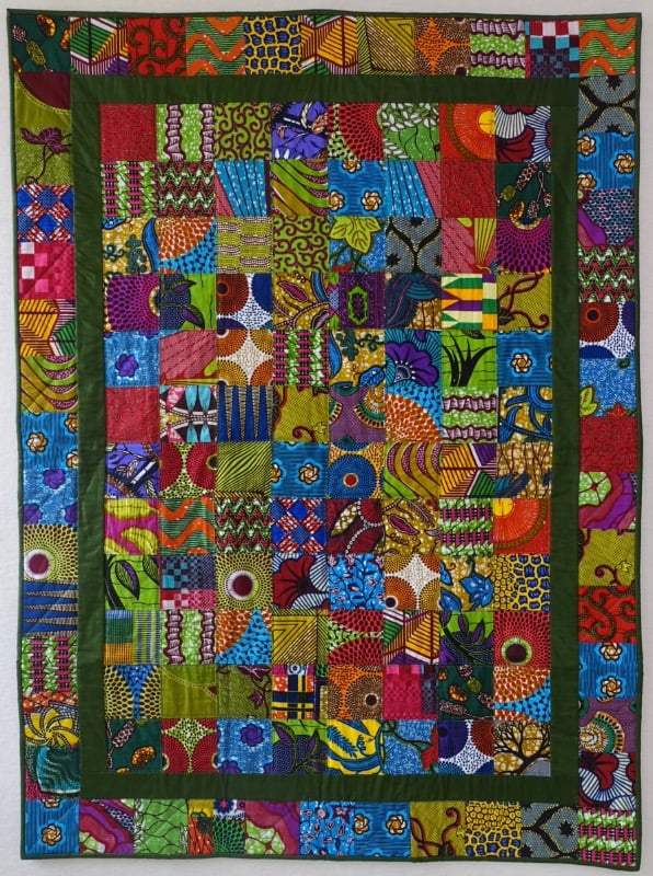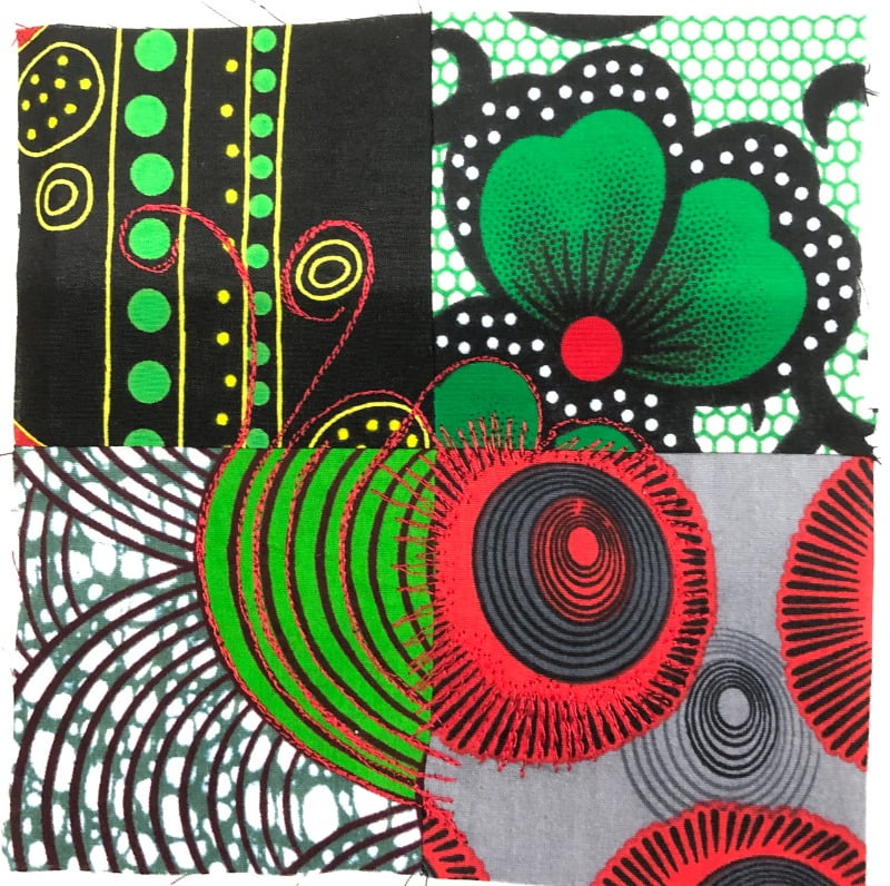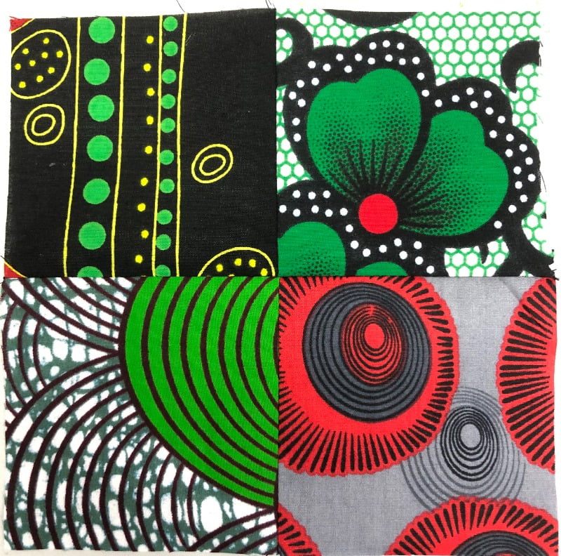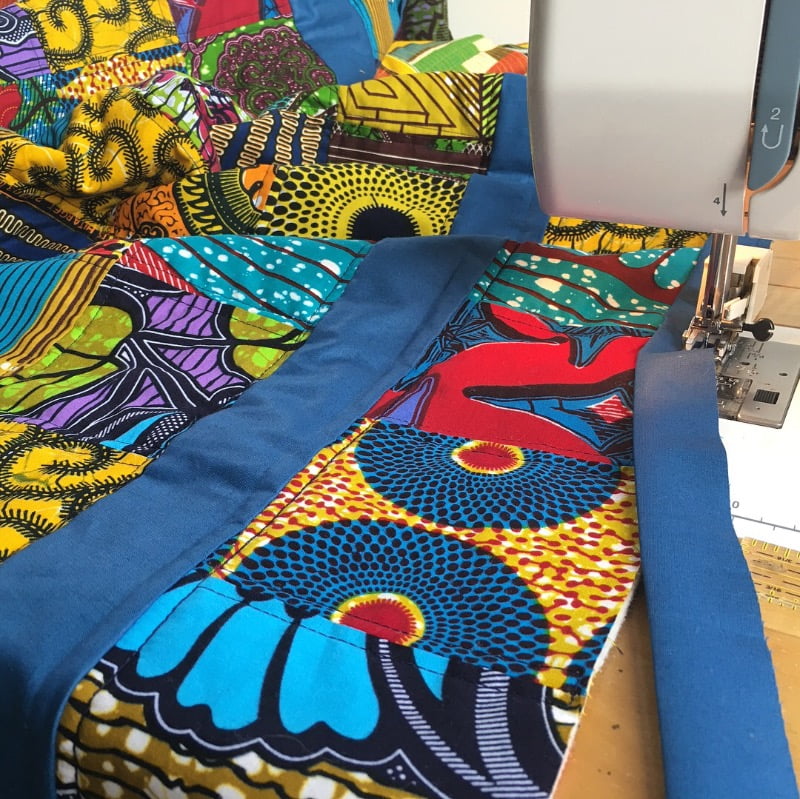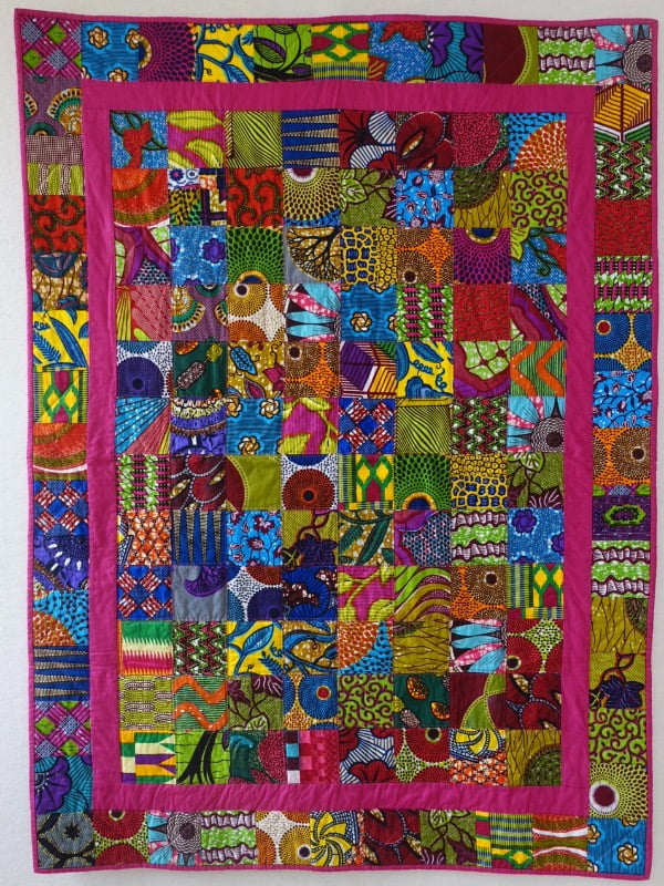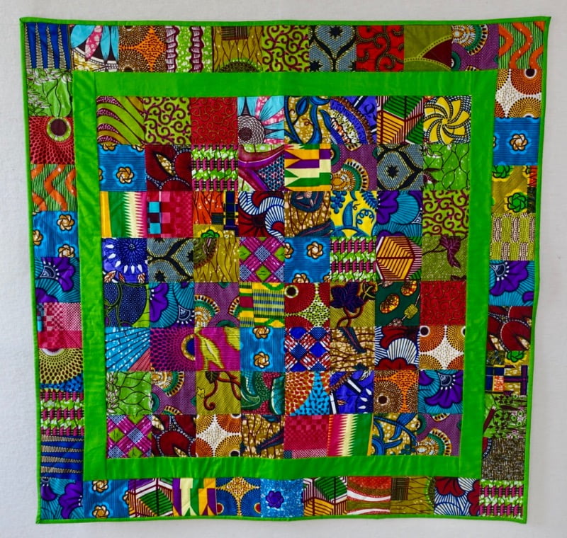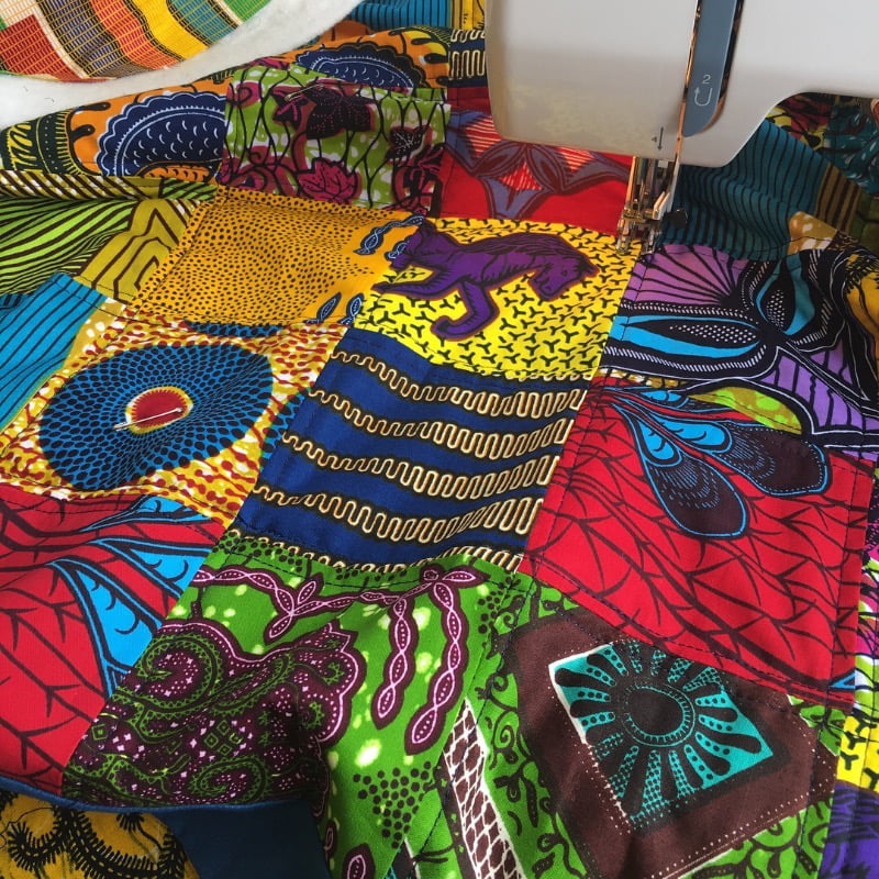 De Afrikaanse stoffen waar ik mee werk lenen zich niet echt om met een overall-patroon doorgequild te worden, dit in tegenstelling tot gewone quiltstoffen. Vaak hebben de Afrikaanse prints een betekenis waar je niet zomaar doorheen kan naaien en de kleuren spreken vaak genoeg voor zichzelf.