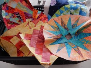 Maar ook de manier van quilten verandert bij mij. Zo quilt ik niet meer met de hand, nou ja alleen de hexagonnen, dat vind ik nog een heerlijk klusje. Zo tussendoor heb ik hexagonnen klaar liggen met Kaffe Fassett stofjes.