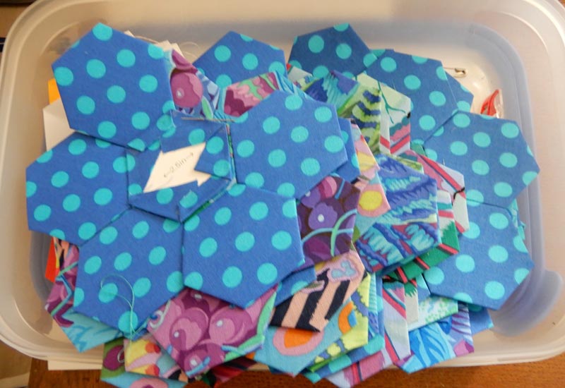 Maar ook de manier van quilten verandert bij mij. Zo quilt ik niet meer met de hand, nou ja alleen de hexagonnen, dat vind ik nog een heerlijk klusje. Zo tussendoor heb ik hexagonnen klaar liggen met Kaffe Fassett stofjes.