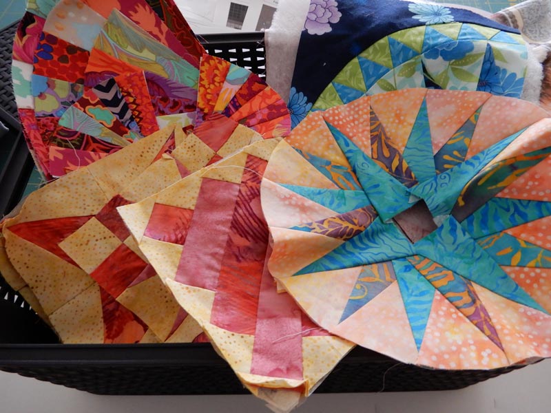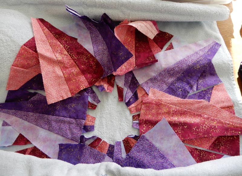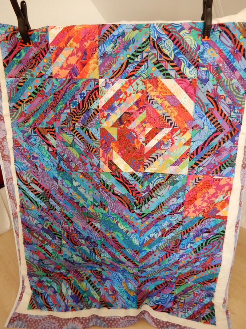 Ik vond een bak met allemaal repen stof van verschillende breedte van Kaffe Fassett stoffen om een ingewikkelde log cabin te maken. Vind ik niet meer leuk en toen heb ik de repen aan elkaar genaaid en daar diagonaal blokken van gesneden.