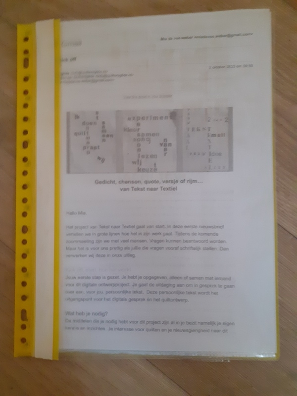Maar nu ben ik even het drukst met het project “Van Tekst naar Textiel”. Een uitdaging voor alle quilters. Met dit project hebben 104 leden meegedaan en nu stimuleren wij de mensen een quilt te maken die dan kan hangen op de Patchwork & Quiltdagen in Rijswijk in april 2024.
