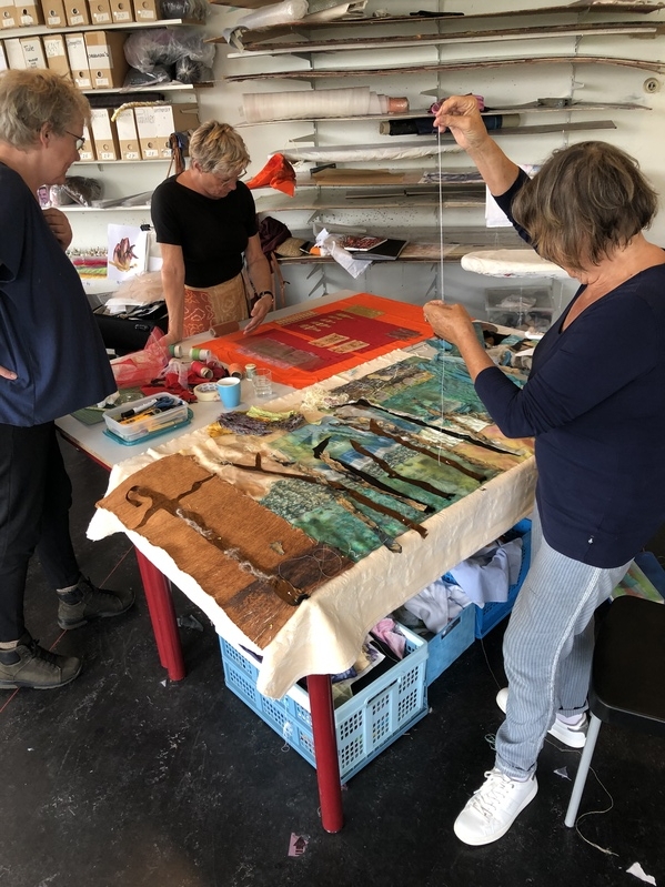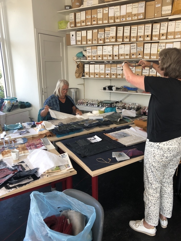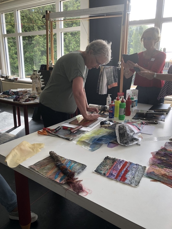 Eke verteld op een gegeven moment dat, als je veel proefjes maakt/uitprobeert, je daarna ook uit veel materiaal kunt kiezen. Dat kun je ook een manier van ontwerpen noemen en ik denk dat zeker voor de artquilters onder ons heel goed werkt.