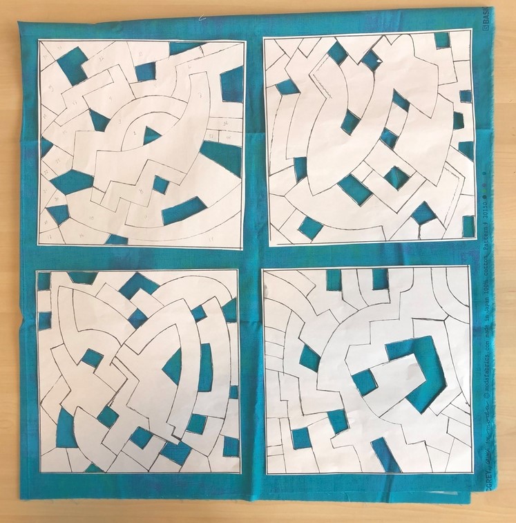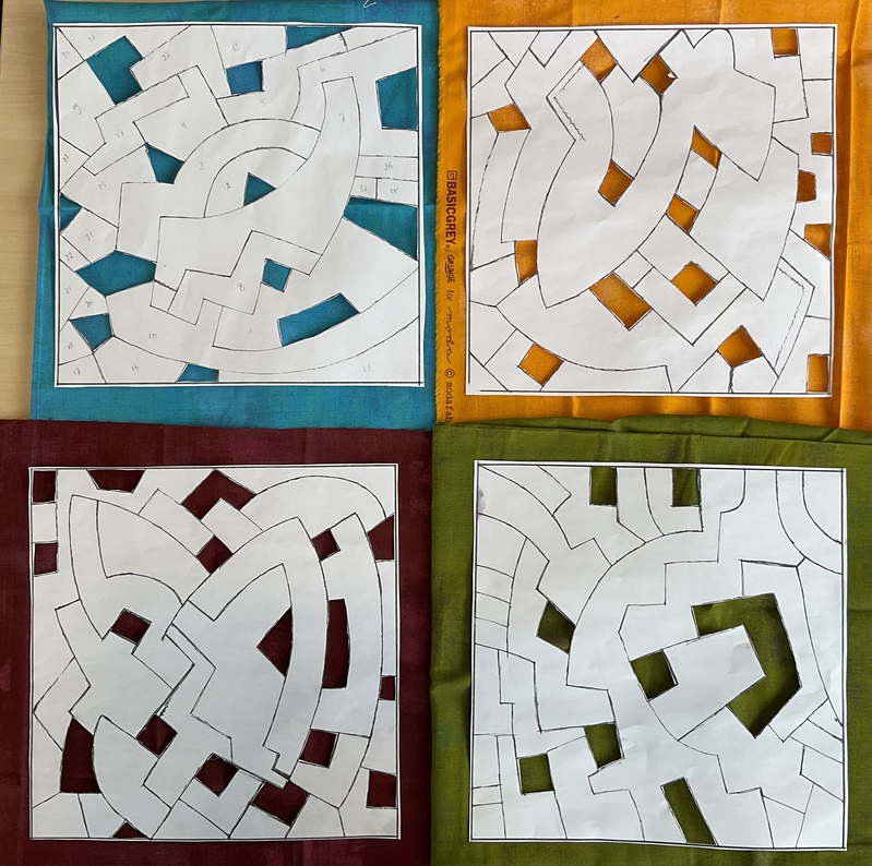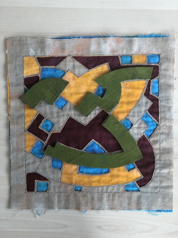 Ik had een aantal blokjes liggen van een proef naar aanleiding van het werk van Herma de Ruiter en bedacht dat daar wel een andere A-kant aan kon komen. Lukte vrij aardig en toen ik ze met een zig/zag wilde dubbelen wilde mijn Elna niet mee werken. Ze sloeg steken over omdat het te dik was.