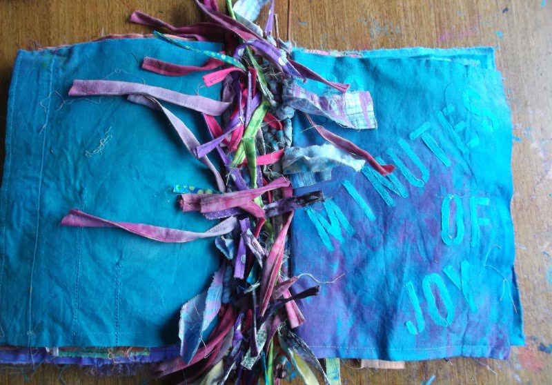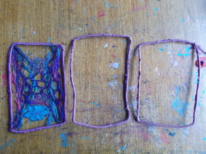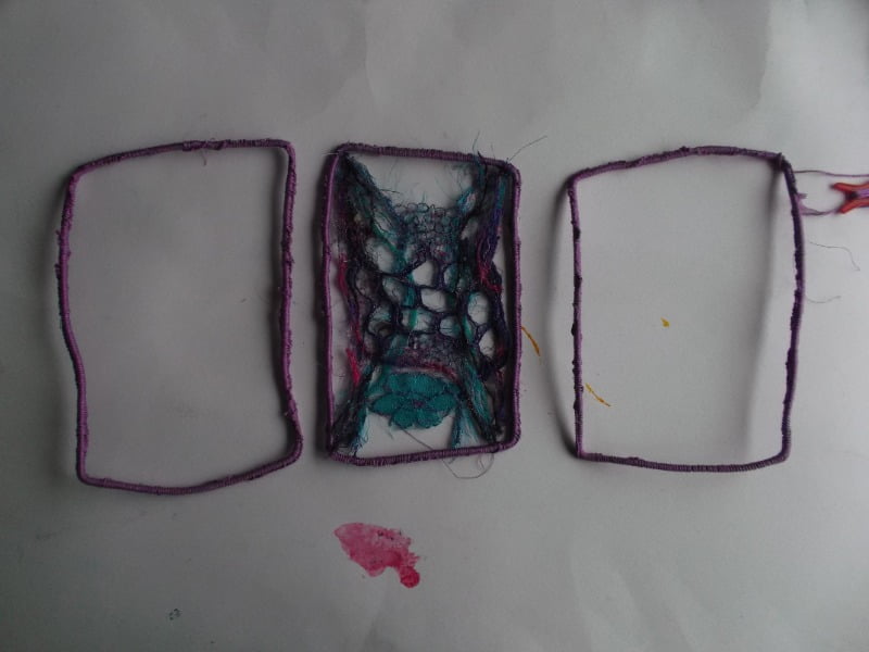 Buiten dat maak ik nog steeds geen “echte” werkstukken. De inspiratie ontbreekt nog steeds. Van een aantal van de half uur collages ben ik een boek aan het maken. Aan de pagina’s zitten 3 dunne bandjes en die bandjes knoop ik om een wilgenteen. Door alle wilgentenen weef ik repen stof zodat ze aan elkaar zitten als een boekrug. Op de einden van de wildentenen kralen om te zorgen dat de stof niet ‘wegloopt’ van de wilgentenen.