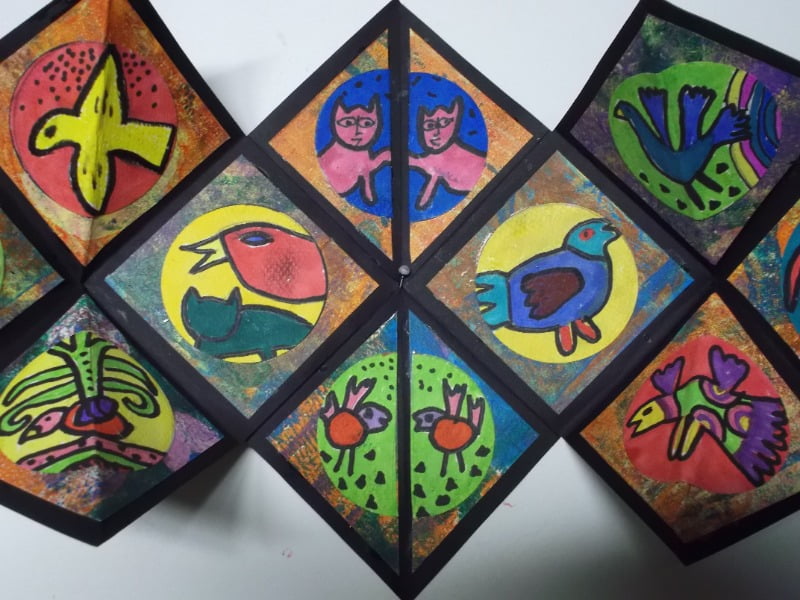 Daarnaast moest ik ook nog een boekje maken voor de Artbooksisterblog (zie https://artbooksisters.blogspot.com/). Elk kwartaal bedenkt een van ons een thema voor een boek en dit kwartaal was het Cobra. Het heeft een poosje geduurd voor ik inspiratie had, maar op het nippertje is het gelukt. Een explosieboek heet deze vorm. Ik had gekozen om alleen naar Corneille te kijken omdat dat mijn favoriete cobra kunstenaar is. Geïnspireerd op zijn vogels en poezen heb ik de afbeeldingen in het boekje gemaakt.
