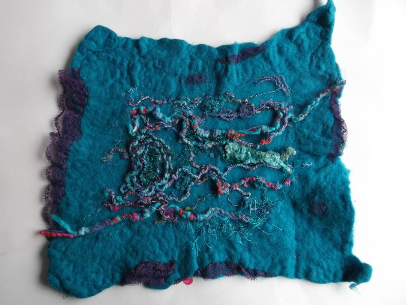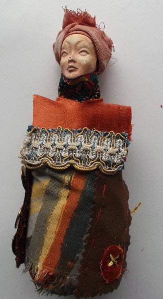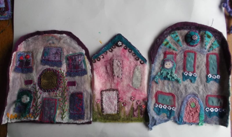 Hieronder de foto’s: een artdoll, een vilten lap en 3 vilten gevels.
