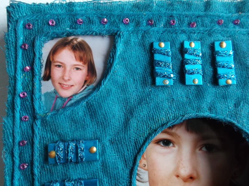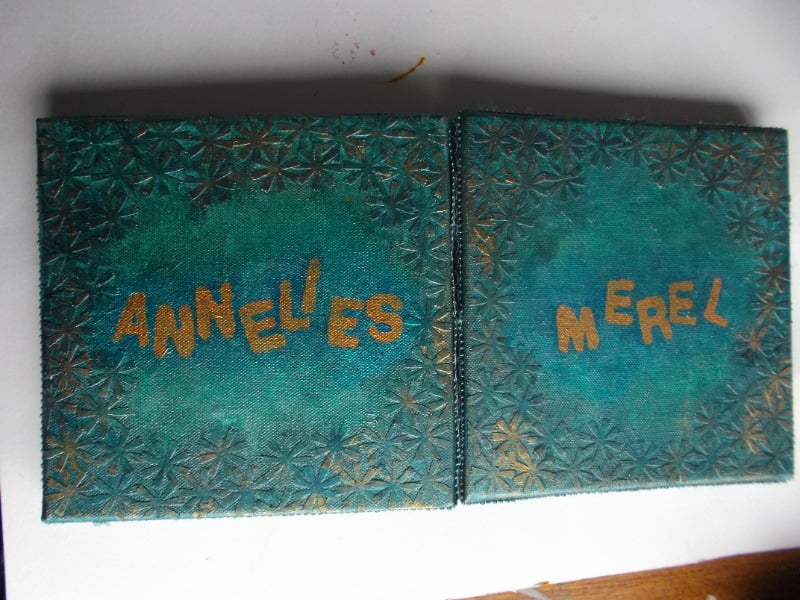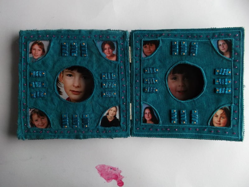 De basis zijn 2 schilderdoekjes die ik met scharnieren aan elkaar heb gemaakt. Op de kant van het doek heb ik uitgeponste figuurtjes geplakt en daaroverheen met metalicverf geverfd. Tegen de achterkant heb ik een stuk verstevigde stof bevestigd dat ik op allerlei manieren had bewerkt. En gaten erin gemaakt op de plekken waar de foto’s moesten komen. De middelste foto zit tegen de achterkant van het doek geplakt en is dus verdiept.