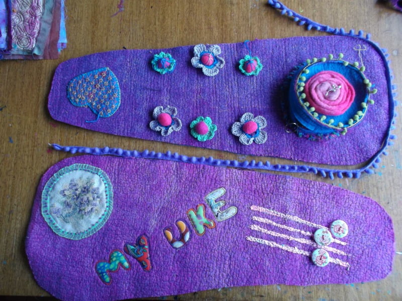 Maar ik zit sinds vorig jaar ook op viltles en mijn viltjuf Brigitte Eertink speelt ook ukelele en die had voor haar ukelele een prachtige tas gevilt. Dat wilde ik ook.