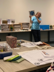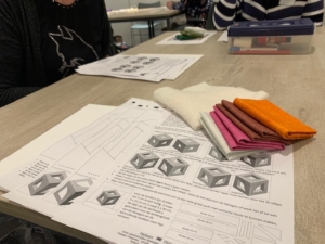 In de ochtend begon (na de koffie met gebak) de ene helft met de workshop ‘Optische illusie in hexagons op traditionele wijze gemaakt’. Heel intrigerend, het lijkt super ingewikkeld maar Heleen wist het terug te brengen tot een rondje schuiven met een paar licht/donkerblokjes. Die stofjes mochten we bij binnenkomst al uitzoeken, dat alleen al was mooie voorpret voor de meeste deelnemers.
