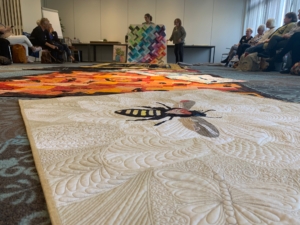 Superleuk, wist je dat ze de eerste longarmquilter in Nederland was (en de tweede in Europa) en dan hebben we het over 1 januari 2000. Niks geautomatiseerde patronen quilten, alles ging op een houtjetouwtje manier. Maar ze durfde het aan en kijk waar ze nu staat. Ze bracht een berg quilts mee, werk gemaakt aan de hand van thema’s, familie herinneringsquilts, wedstrijdquilts, en allemaal even fraai gequilt natuurlijk…