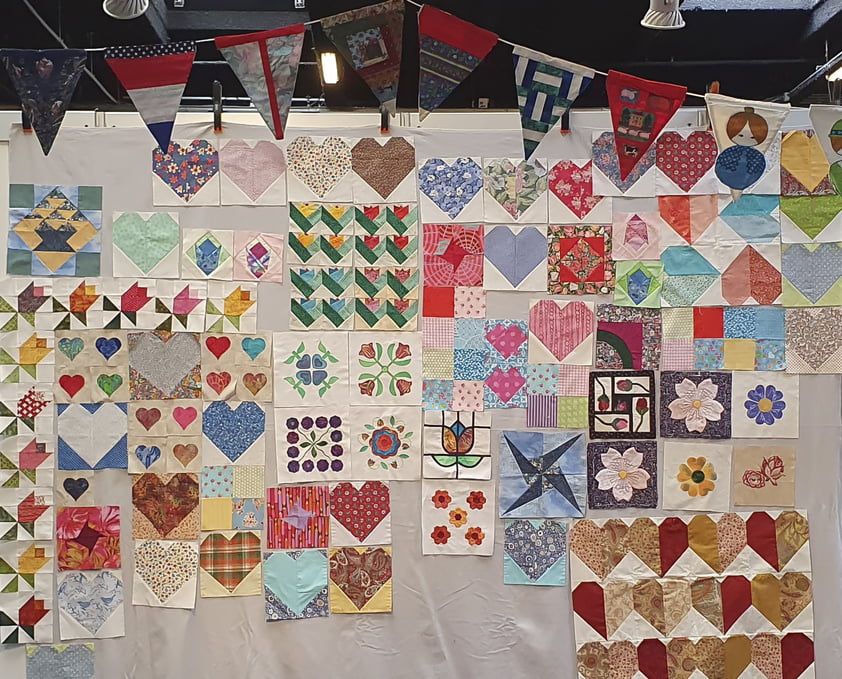 Bijna 70 quilters waren uit alle windrichtingen naar de Schakel in Nijkerk gekomen voor een miniworkshop en een trunkshow.