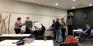Zondag na het ontbijt uitchecken en weer heerlijk aan de slag met het werkstuk tot aan de lunch. Na de lunch kunnen we nog een uurtje werken en dan is het opruimen. De werkstukken worden opgehangen of neergelegd en besproken met de juf van die dag. Bij ons was dat Elfriede. Daarna zijn we in de andere lokalen de werkstukken gaan bekijken.