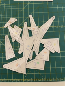 Stilletjes hoop ik dat het geen rood is, want dat is echt niet mijn kleur! Eind december 2023 komt het verlossende mailtje met de link naar de kleur van de fat quarter, oh help het is ROOD!!! De moed zinkt me wel even in de schoenen, maar goed opgeven is geen optie. En een klaproos is ook rood en die vind ik wel mooi, dus ik zal het ermee moeten doen. Maar ja, paars vind ik een mooie kleur en die moet er toch echt in. Eigenlijk wil ik de stof die nog in mijn kast ligt, gekregen van mijn zoon en schoondochter voor de Kerst, in mijn ontwerp gebruiken. Maar ik schijn altijd net iets tekort te komen en de quiltwinkel waar ze de stof gekocht hebben, is helaas permanent gesloten. Op de stof staat natuurlijk net niet welk merk, etc., het is. Nu kan ik blijven klikken en schuiven met de kleuren in het ontwerp, dus ga ik maar gewoon beginnen en zie wel waar het schip strandt. Dus, alle sjablonen uitprinten, insealen, uitknippen.