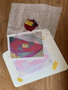De 4 blokken van het midden patroon van de quilt op Vlieseline L11 tekenen. Stof uitknippen en op de hand aan elkaar naaien.