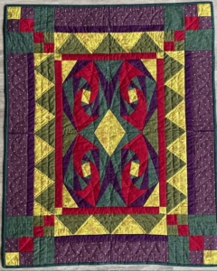 Het Quiltersgilde is uitgenodigd om in september 2024 tijdens de European Patchwork Meeting in de Elzas in Frankrijk een tentoonstelling in te richten. Op 1 december 2023 geef ik mij op voor deze Carrefour Européen du Patchwork. Vol goede moed schuif ik achter mijn laptop om een ontwerp te maken met mijn ontwerp software. Nu ben ik nog niet zo handig hierin, maar met een hoop geklik en opnieuw beginnen, rolt er dan toch na enkele weken een ontwerp uit. Maar ja, welke kleuren ga ik gebruiken, want we weten nog niet welke kleur de fat quarter is die je in het ontwerp moet gebruiken.
