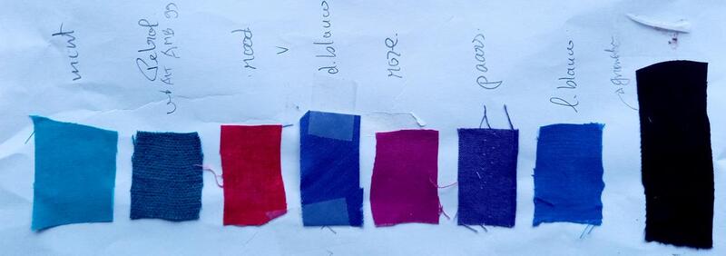 Stoffen kiezen: zelf volgde ik onlangs, halfweg oktober, een cursus ‘met indigo verven’ bij Vrouw Wolle in Essen (België, aan de grens met Nederland). Dat lag al geruime tijd vast, maar het moment kon niet beter komen: ik heb er katoenen stof geverfd in verschillende tinten indigo, om in deze challenge te verwerken. De lichte tinten in indigo met een fructosebad, de donkere tinten in een indigobad met ijzersulfaat. Wat het upcyclen betreft, ik gebruik stoffen van mijn overleden vader, van mezelf, mijn dochter en mijn man. Verder zitten er ook stoffen in uit mijn voorraad, ik kocht bewust geen enkele nieuwe stof bij.