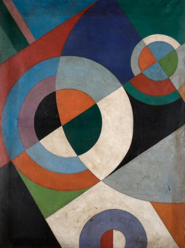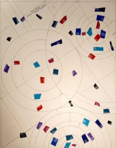 Als ik nu eens een “broer” maak voor deze quilt. Zelfde maat, ander ontwerp, andere cirkels en andere kleuren. Ze horen dan bij elkaar, zijn anders maar toch familie. Het idee is er, nu nog het ontwerp. Na lang nadenken en onderzoek kwam ik uit bij Aleksander Rodchenko, een Russische kunstenaar uit diezelfde periode. Zijn schilderij heeft qua basis mooie vormen maar het moet nog wel gaan passen in het uiteindelijke ontwerp.