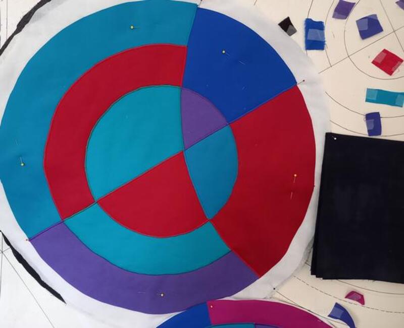 Op naar de volgende fase. Het ontwerp heb ik dus op tafel geplakt. Zo kan ik de afzonderlijke onderdelen makkelijk overnemen en behoud toch het totaaloverzicht. Ik werk namelijk in eilandjes. Van alle gekleurde delen maak ik kleine quiltjes. Tekening overnemen op een ondergrond, dan de losse onderdelen van de cirkels (en andere vormen) op Flisofix plakken en dan heel precies op maat uitknippen. Ik doe dat met 2 mm extra. Uiteindelijk moeten de onderdelen koud tegen elkaar gelegd worden voor verdere behandeling en dat past natuurlijk nooit. Dan heb je dus 2 mm speling die later weer verdwijnt onder het cordon. De stukjes stof met Flisofix plakken we op de ondergrond, stukje plakbare Hobbs er achter en een dun achterkantje. Zo, Miniquiltje klaar.