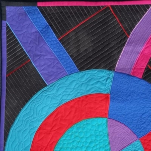 De quilt is nu klaar om op de hand door te quilten en, ja, daar loop ik tegen het volgende probleem aan. Wat ga ik nu gebruiken om het patroon op de top te tekenen? De stof is te donker om een frixionpen te gebruiken, want dan blijven er witte strepen bij het wegstrijken over. De witte variant is ook geen optie na het testen op een proefstukje. Als ik de quilt zou wassen, zou ik wash away gebruiken en daar het patroon op tekenen. Maar voor een quilt voor een tentoonstelling is dit niet handig. Uiteindelijk het patroon en de borders met wit krijt op de quilt getekend en hierover heen gequilt. Na het doorquilten de bies eraan gemaakt, een tunnel bovenaan de quilt en een mooi label (op het ontwerp programma) gemaakt voor de quilt en hoes volgens de richtlijnen op de site van het quiltersgilde. De quilt, bies voor het latje, label en hoes zijn ruim op tijd klaar!