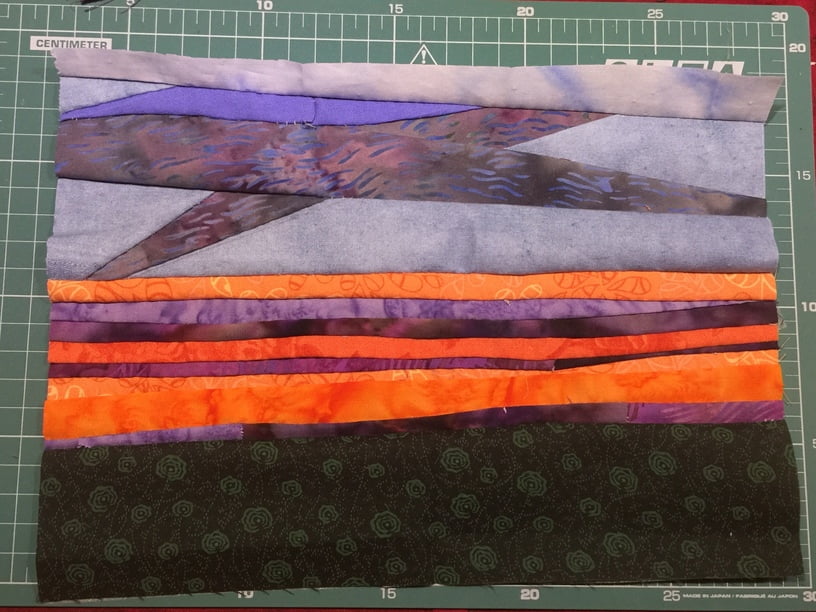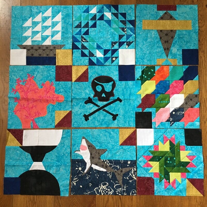 Elke keer is het weer spannend hoe je blok eruit komt te zien in de stofjes die je vooraf koos op basis van een kleurenpalet en het thema ‘Murder on the high seas’.