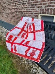 Dit patroon staat al lang op mijn wensenlijstje. In het boek ‘Steekjes in en om het Huis’ van Mandy Shaw pag. 68 zag ik een leuke quilt in vierkantjes. Rondom een applicatie komt een rand vierkantjes. Op de hoeken naai je op het vierkant een hartje. De centrale applicatie betreft iets waar je hart vol van is. Het huis, de caravan, de huisdieren. Heel persoonlijk en liefdevol. Want dat gaat het worden als je iets rondom of met harten gaat verwerken in je quilt.