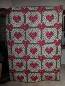 Het hartpatroon voor het Redwork heb ik ook gebruikt voor de hartenapplicatie in verschillende Westfalenstofjes. Deze stoffenverzameling heb ik in de loop der jaren in Nieuw Buinen, het Openluchtmuseum en de quiltwinkeltjes in de Achterhoek in verschillende combinaties gekocht.