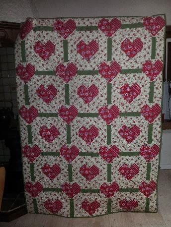 De Romantiek was als historische stroming in de 18e en 19e eeuw een tegenactie op de Verlichting. De subjectieve ervaring werd als uitgangspunt genomen. Introspectie, intuïtie, emotie, spontaniteit en verbeelding kwamen centraal te staan. Je romantisch uiten in feesten, cadeau of boeketten is ons wel bekend. Maar ook in quilts kun je je romantisch uitdrukken. Een prachtige in roze tinten hartjesquilt voor een kleindochter door Wilma te Kampe zoals op onderstaande foto of een ‘watercolour’ hart… En ja hoor, ik ben weer waar ik wezen wil, bij mijn Quiltideeën!