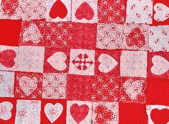 Mijn hiervoor genoemde verzameling Westfalen-stofjes zet ik in voor dit onderdeel. In de rood-wit tinten heb ik combinaties gemaakt. Een witte ondergrond met een rood hart en andersom vormen het begin.