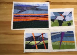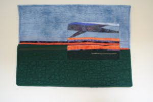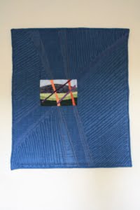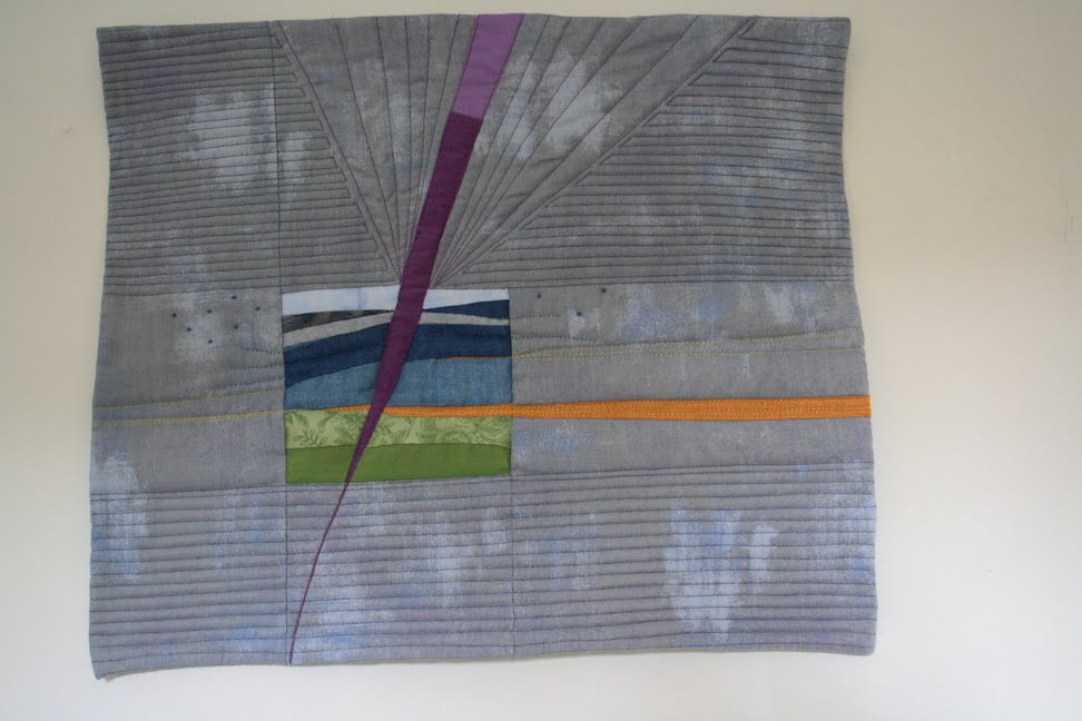 Fijn als een groep je uit je twijfels haalt en iemand zegt “plaats die mini quiltjes in een groot vlak, de zogenaamde ‘negatieve ruimte’”. Met deze suggesties ben ik verder aan de slag gegaan. Natuurlijk zijn er ook dan nog genoeg keuzes te maken in kleur, vorm, de positie in het veld, de wijze van doorstikken etc. Het zal iedereen wel bekend voorkomen. Ter illustratie laat ik er hier maar een paar zien.