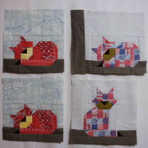 Een eerste start is er; de boerenzakdoeken worden verwerkt in een poezenquilt voor het volgende achterkleinkind. De titel en de eerste blokken zijn al klaar: ‘Poesjes van Oma’. Ze hield namelijk ook heel veel van haar poezen.