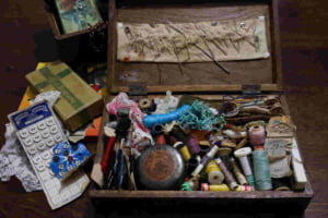 Haar naaigerei bewaarde ze de laatste jaren in een eiken kistje dat ze had geërfd van een oudtante. Dat was ze gewoon gaan gebruiken zoals ze het had gekregen. Met inhoud en al, zoals je kan zien.