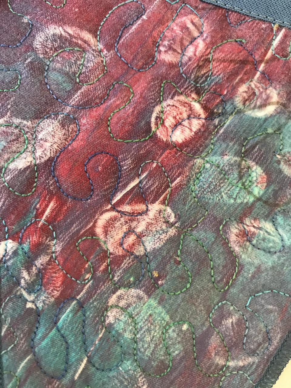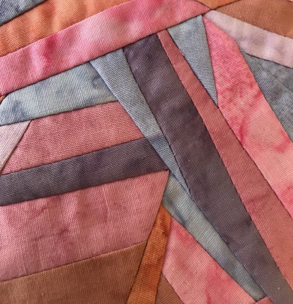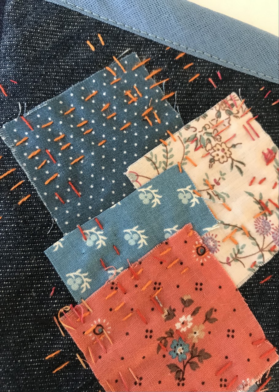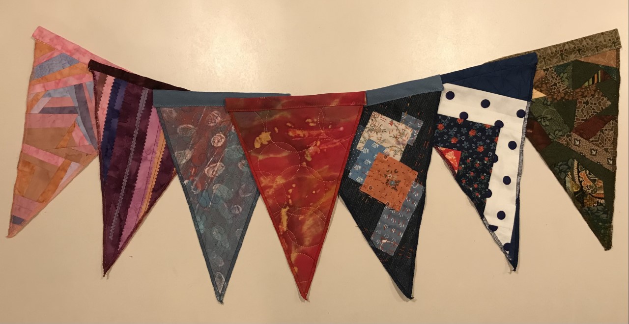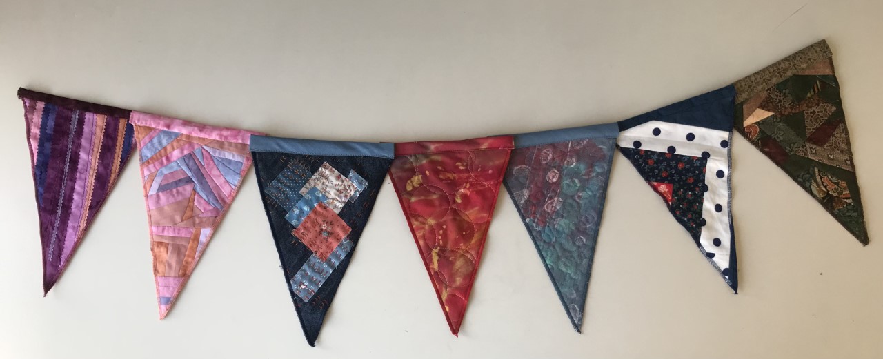 Ik ben gestart met het maken van de mal voor de vlag en gebruik dit om de maat te checken bij de proeflapjes enz. van wat ik nog had liggen. Zo kon ik twee traditionele blokken diagonaal gebruiken. Het proeflapje van boro/shashiko paste net, wat restjes van crazy patchwork verwerken, lekker simpel reepjes opnaaien op ondergrond en los gaan met geverfde lapjes op de naaimachine. De vlaggen waar ik tevreden over was heb ik op maat gesneden en met een rolzoompje op de lockmachine afgewerkt. Aan de bovenkant is een tunneltje gestikt waar de lijn straks doorheen gaat.