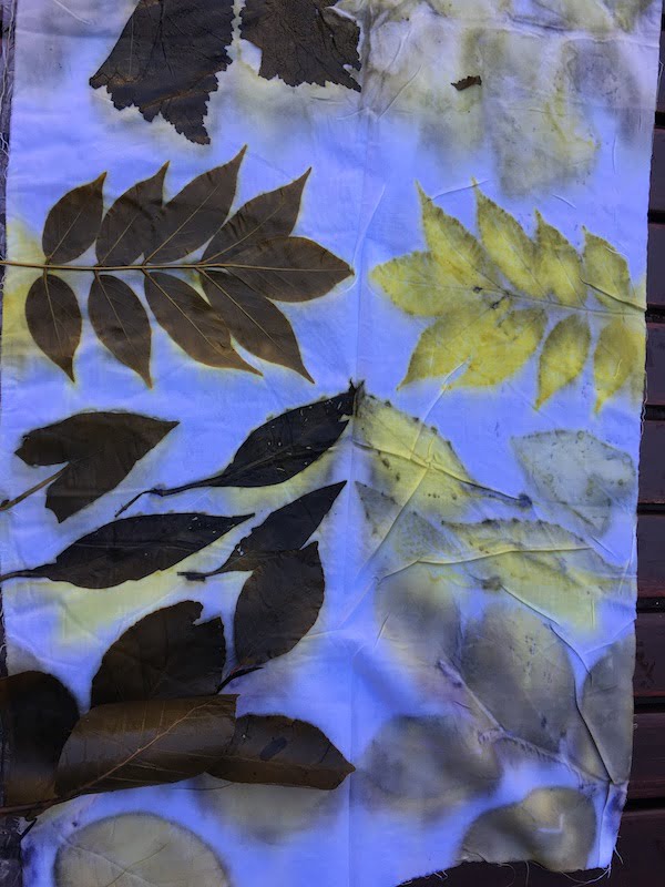 Om de kleur van de bladeren nog beter uit te laten komen worden deze in een badje van water en azijn gelegd. Daarna maak je een mooie compositie op de helft van een voorgeweekte lap. De andere helft van de lap sla je er vervolgens overheen en het geheel rol je stevig om een stok. Dan met touw of fietsband (dit speelt ook mee in het resultaat) het geheel afbinden en in een pan kokend water met ijzersulfaat zo’n 2 uur laten pruttelen. Doe dit vooral buiten want het ruikt niet bepaald lekker! Na nog een nachtje wachten kan het uitpakken beginnen. De doeken goed uitspoelen met water, drogen en strijken.