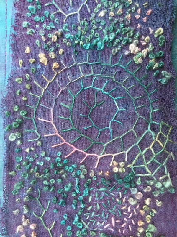 Daarop borduurde ik gewoon waar ik op dat moment zin in had. Geen patronen, geen vooropgezette ideeën, gewoon voor de voet weg. De lap was gekleurd met roest en thee en ik borduurde in verschillende kleuren bruin.